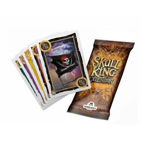 Skull King : Extension vous propose de nouvelles cartes additionnelles dans la continuité du jeu pour une intégration simple. Vous y trouverez 12 cartes de couleurs qui suivent les règles du jeu initial et 7 cartes spéciales avec de nouvelles capacités. Découvrez Mary Throne, la nouvelle pirate de l'équipage, et forcez l'un de vos adversaires à jouer une carte de votre choix. Le supplice de la planche, la dernière salve, la raie tachetée et encore d'autres cartes spéciales vous donnerons de nouveaux moyens de renverser la partie pour tenir vos paris ou pour couler vos adversaires. L'extension vous permet également d'ajouter un joueur supplémentaire et de faire des parties jusqu'à 9 joueurs.