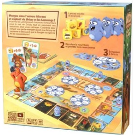 3-Esquivez Grizzy : Le dernier dé fait avancer Grizzy selon la carte tirée. S’il rattrape un Lemming, celui-ci perd une partie de sa nourriture.